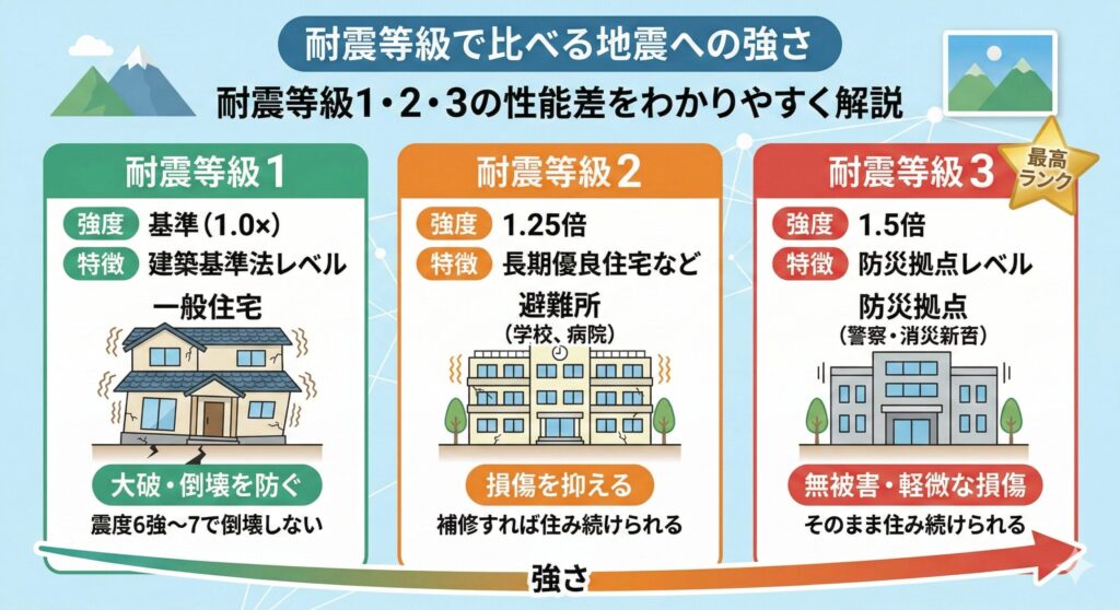 耐震等級は1〜3まであり、数字が大きいほど、地震に強い家を意味します。