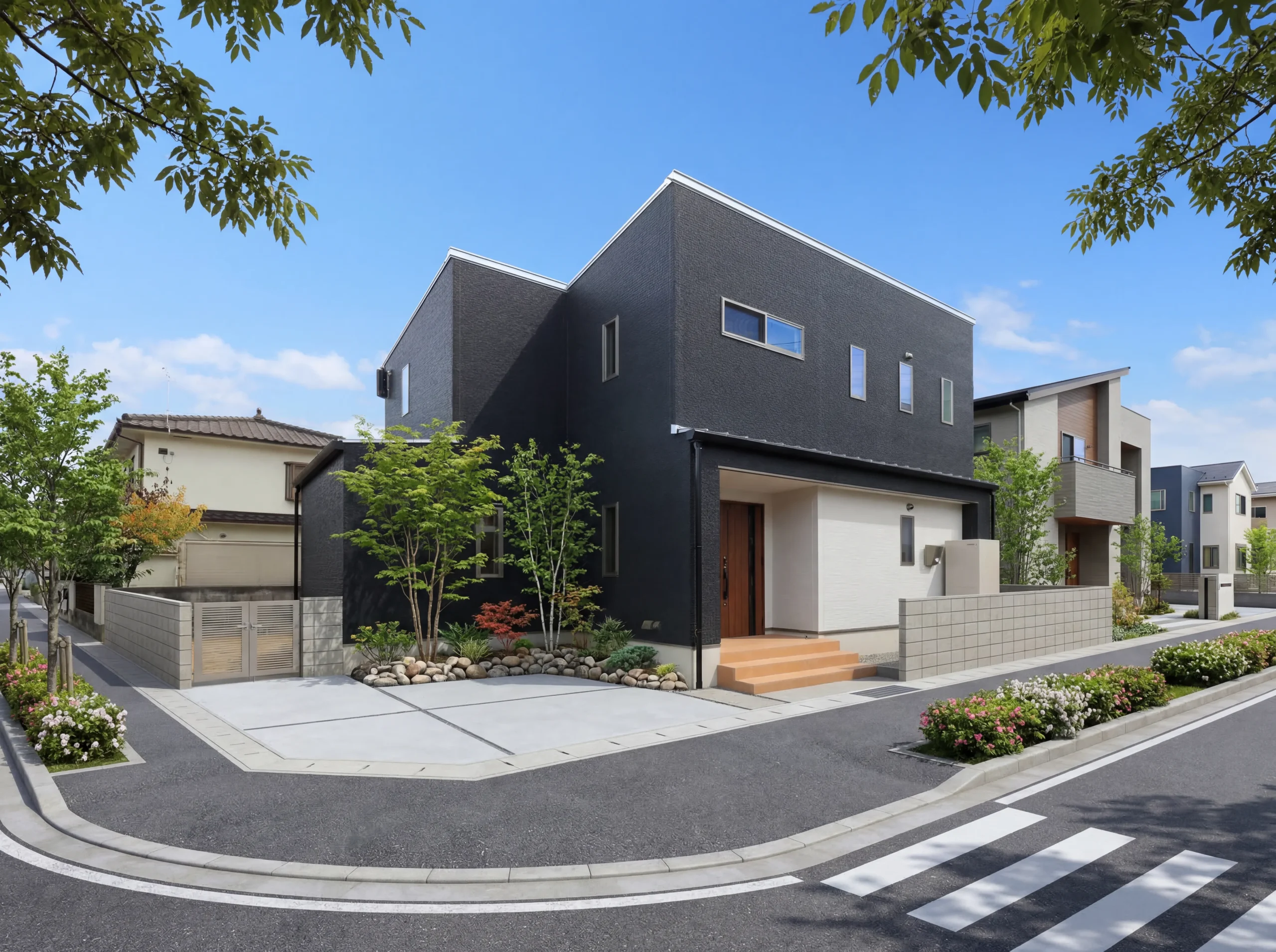 洗練されたスタイリッシュな外観と、24.4帖もの広さを誇る大空間のLDKが特徴の住まい。モダンでカッコイイデザインが目を引く外観は、シンプルながらも存在感があり、自然に調和しながらも個性を放ちます。直線的なフォルムやシックなカラーリングが、住む人のセンスを感じさせる仕上がりです。