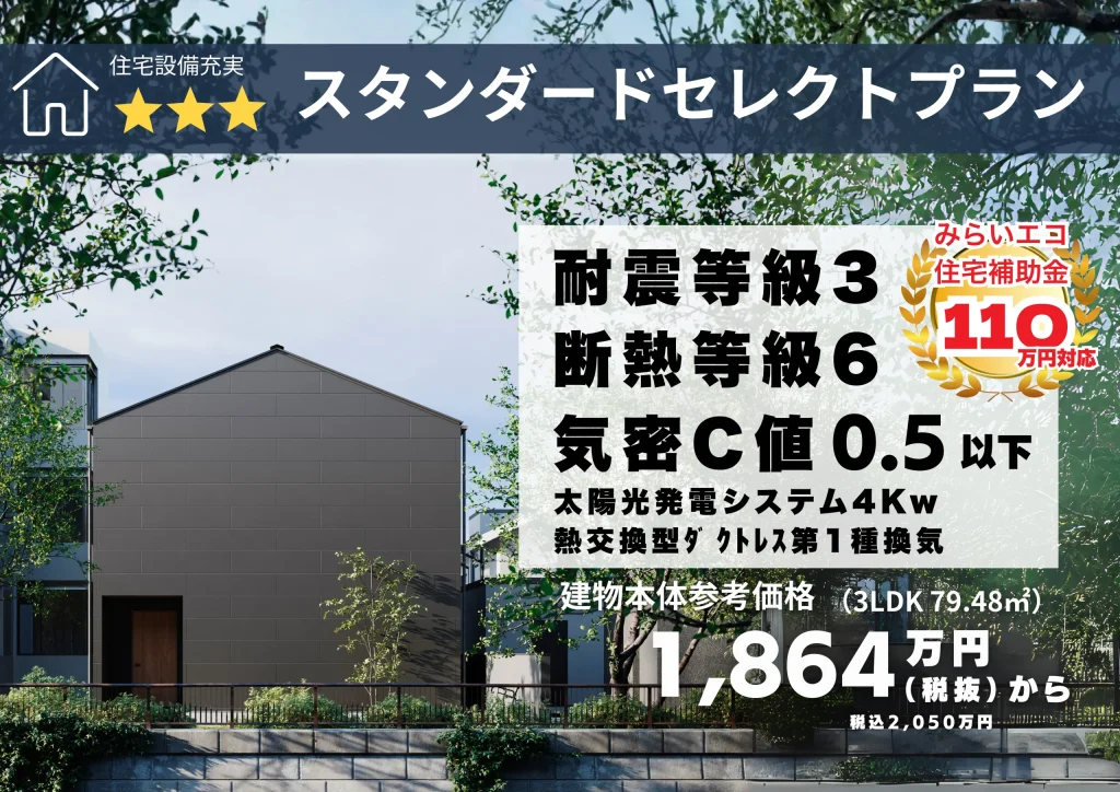 スタンダードセレクトプランは、これから家づくりを始める方にも、性能と価格のバランスがわかりやすいように考えた住まいのプランです。
